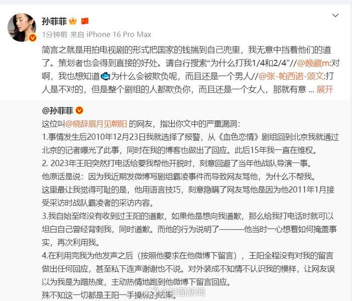 此前,孙菲菲曾指控该片导演张汉杰策划暴力事件,副导演当众吐痰殴打、制片人姚远参与围殴,引发广泛关注。今年7月,她还就“蹭王阳流量”争议两度发声:7月8日否认蹭流量,称当年为其澄清是应对方要求;7月18日再发长文,表示从未收到王阳道歉,质疑对方当年“背刺”并“再次利用自己”,而王阳此前曾两次回应称自己并不在场。